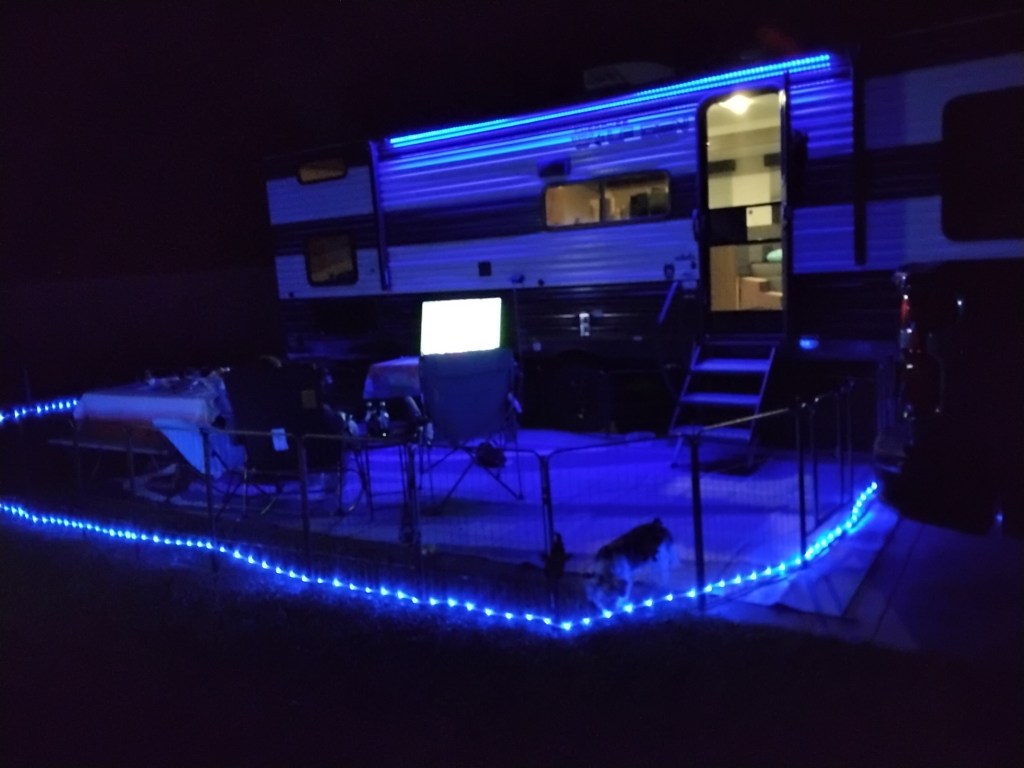 Got a bit of a late start… got on the road around noon. We got some rain, some heavy rain, on the drive here. Arrived about 4 and had a damp setup, did not set up the patio as there was more rain expected.
